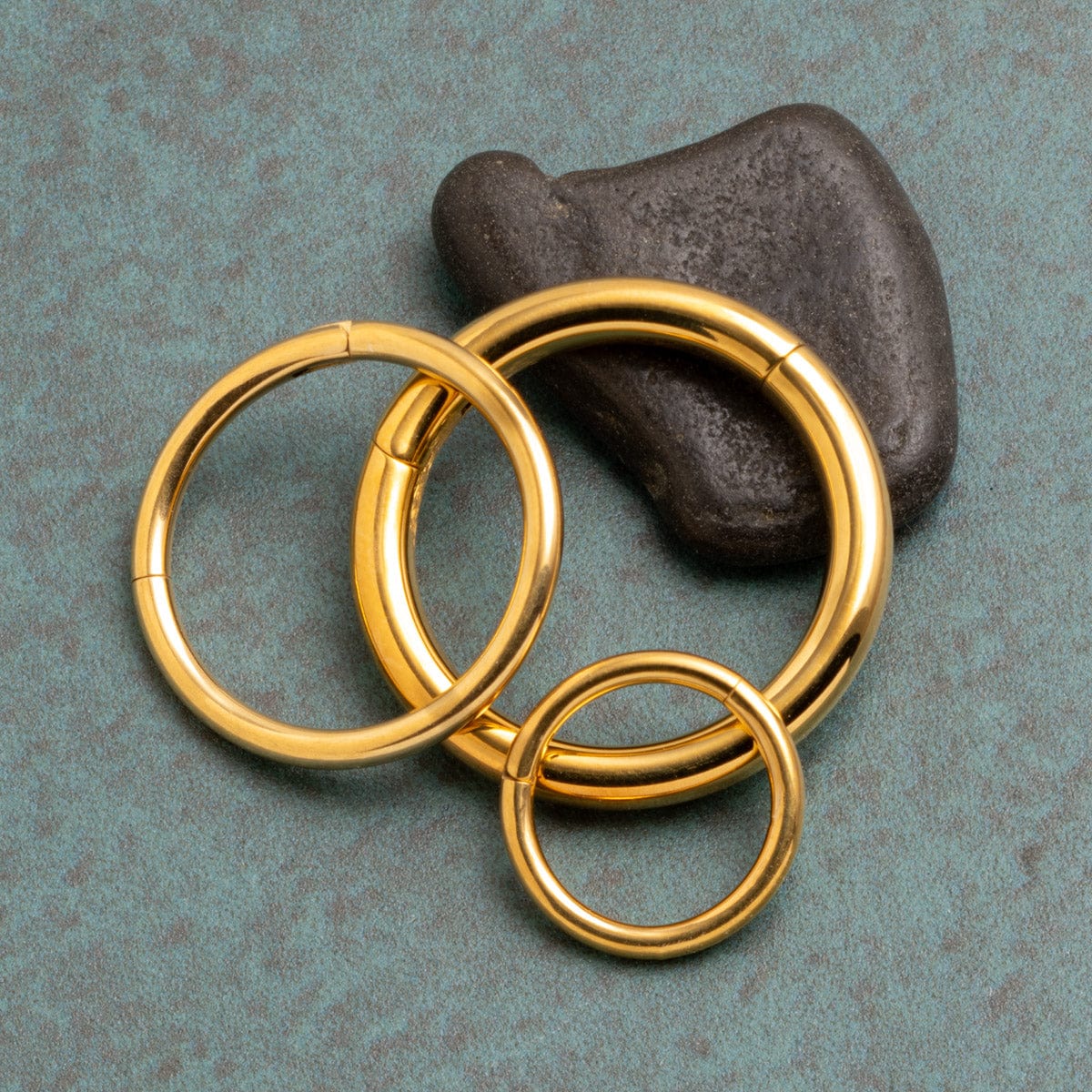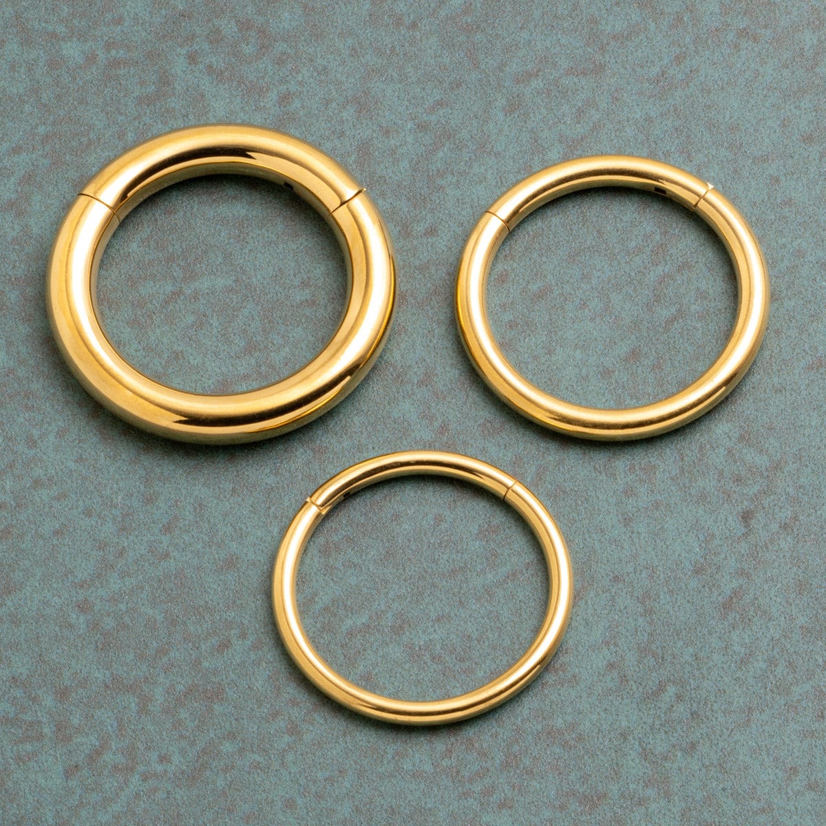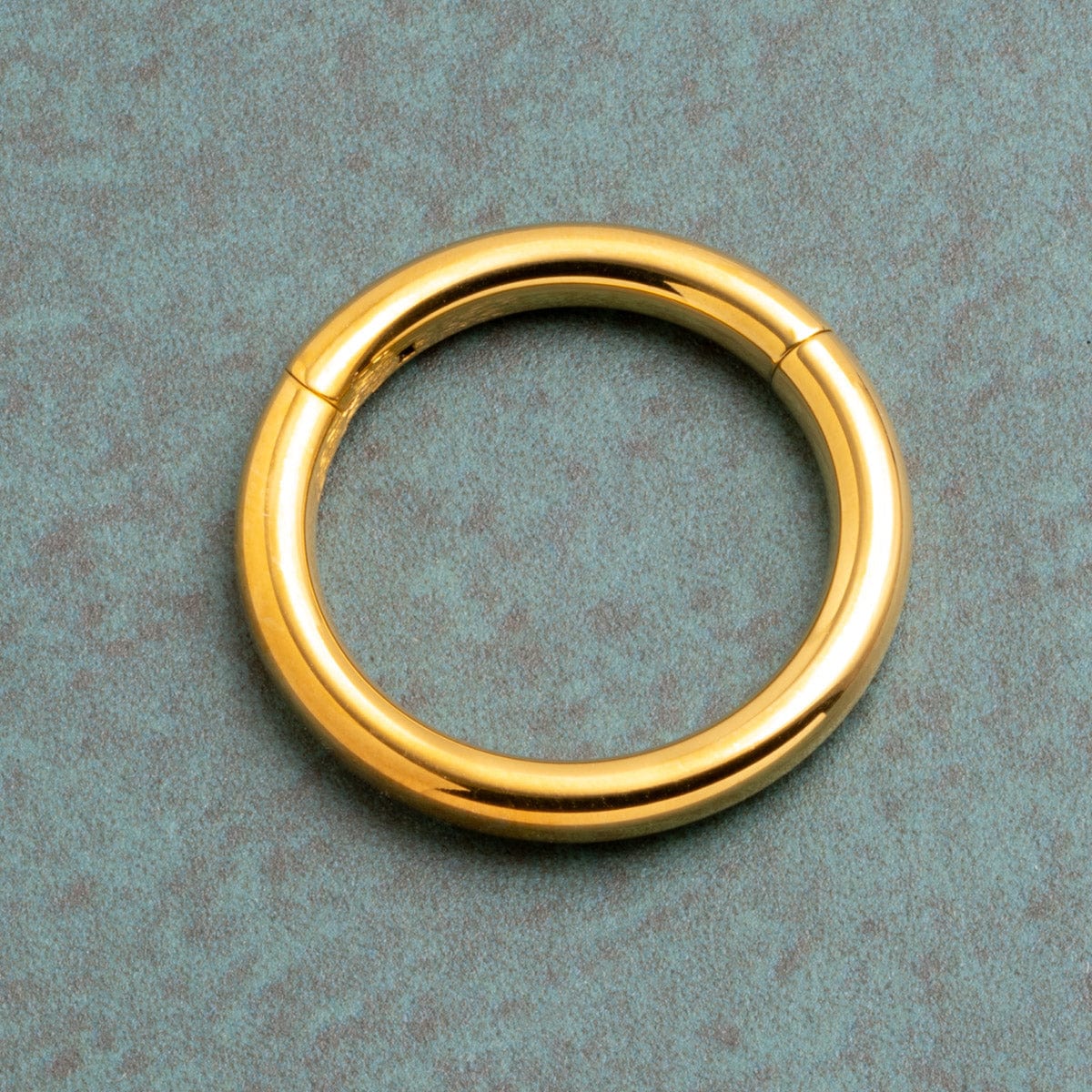 Elevate your piercing collection with our stunning 24k Gold PVD Titanium Hinged Segment Ring. This luxurious piece features genuine 24k gold applied through a Physical Vapor Deposition process, creating a brilliant, eye-catching finish that exudes elegance while maintaining the lightweight comfort of premium titanium construction.