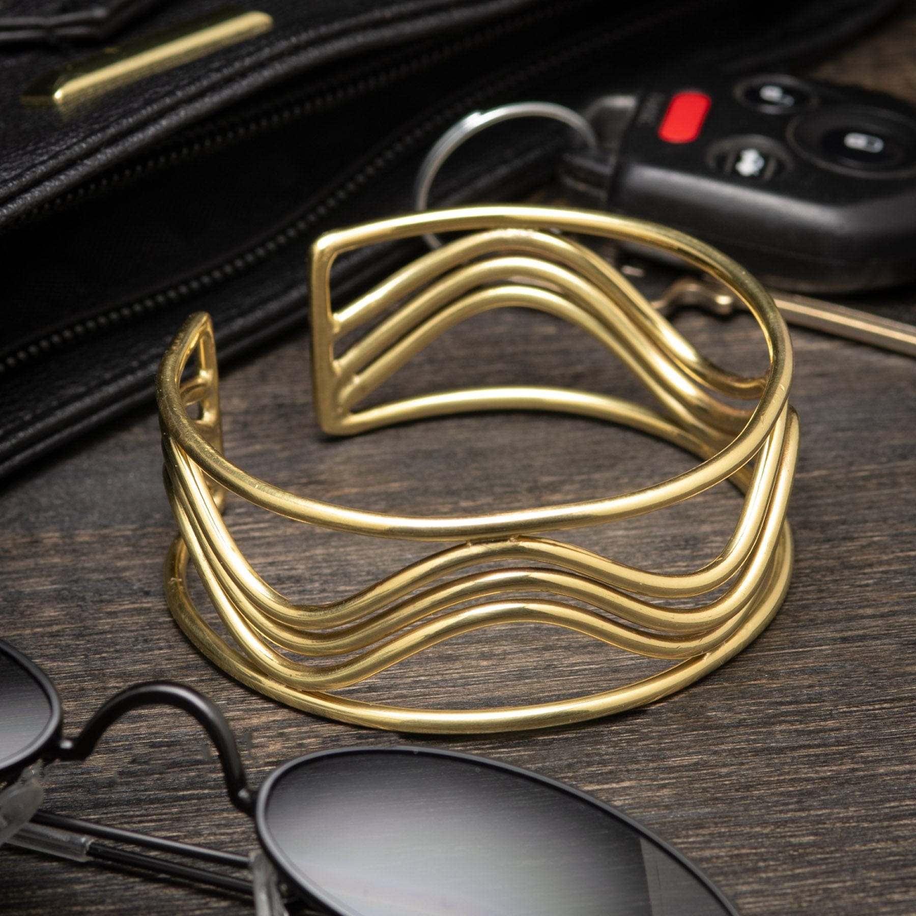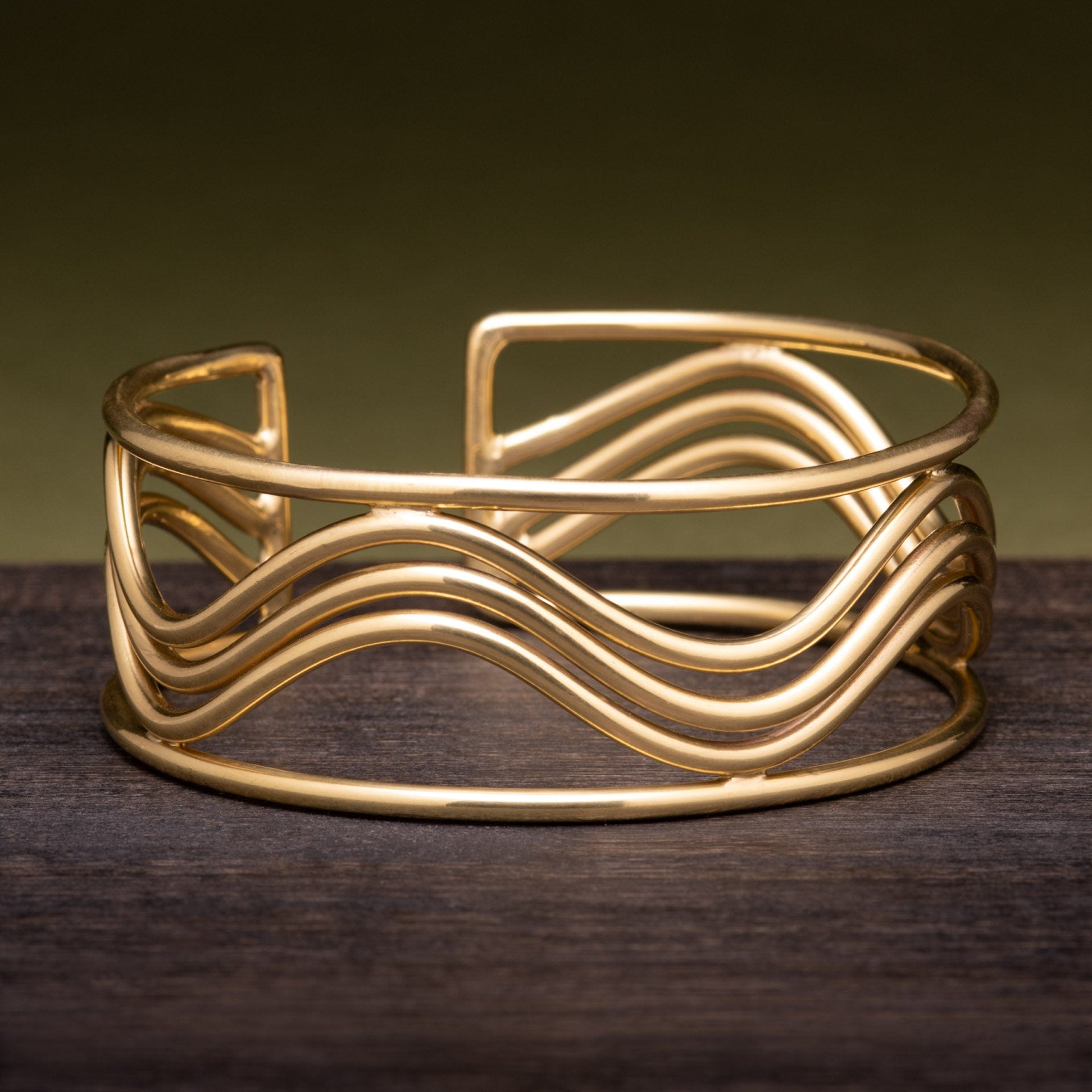 Bring the sunshine with this golden brass cuff, handcrafted to move and gleam as you do. A cascade of curved bars mirrors the play of light and shadow, adding subtle dimension to any look.