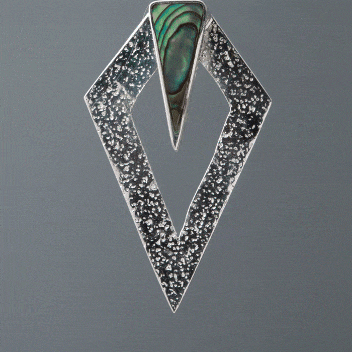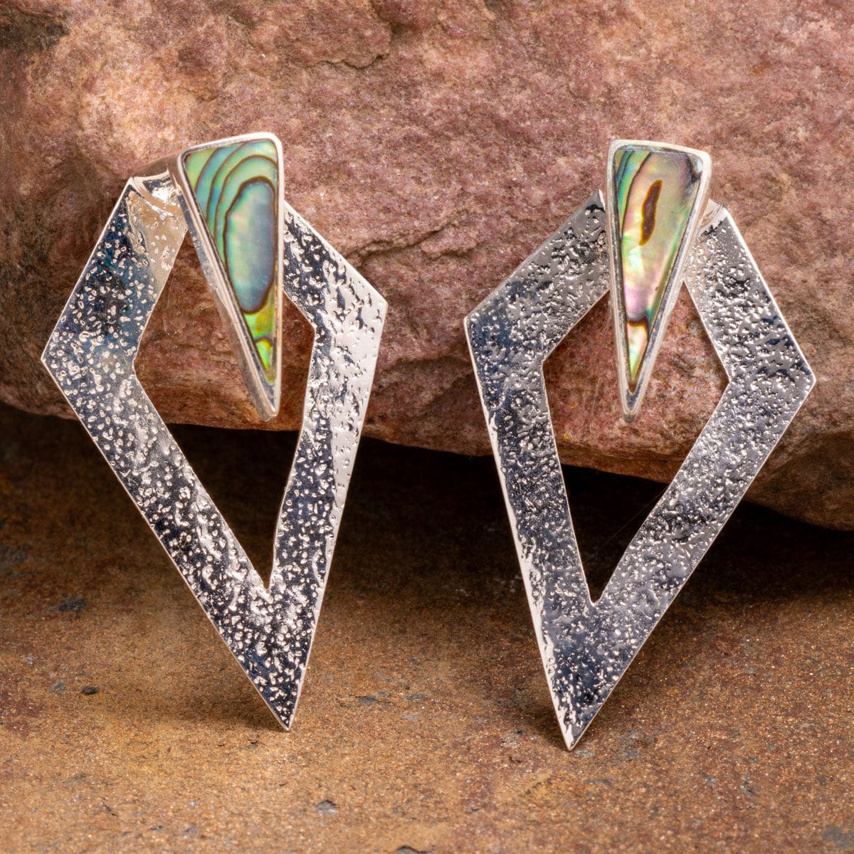 Make waves with these geometric silver-plated brass hangers crowned with genuine abalone. The sharp diamond silhouette brings a modern edge, while the iridescent abalone flashes ocean blues and greens with every move. It's mermaid energy meets architectural chic.