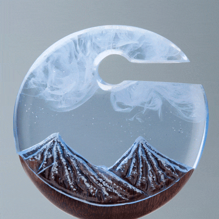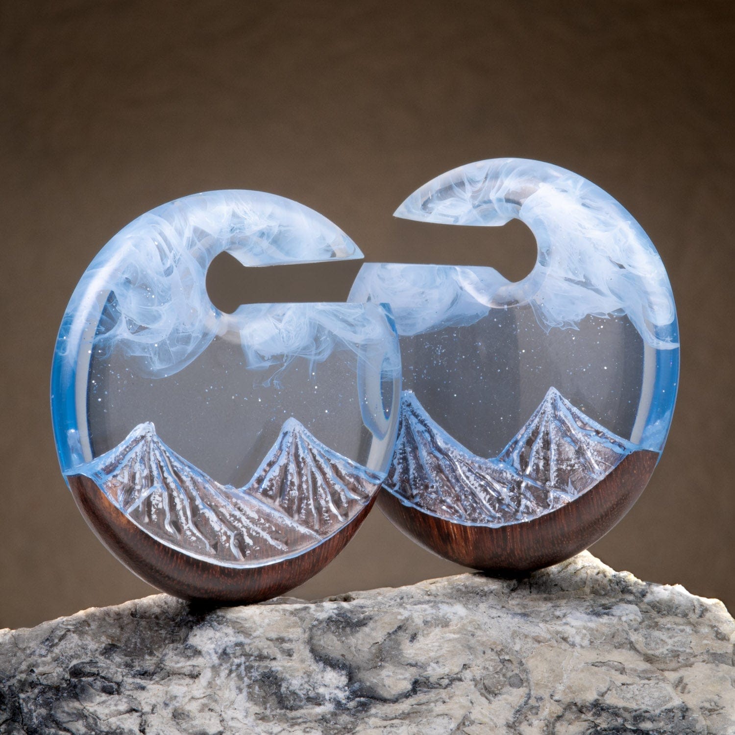 Look closely and you’ll see swirling clouds rolling over snow-covered ridges, all captured in glossy, crystal-clear resin. The careful mix of blue, white, and rich brown creates a tranquil yet striking view on each ear.