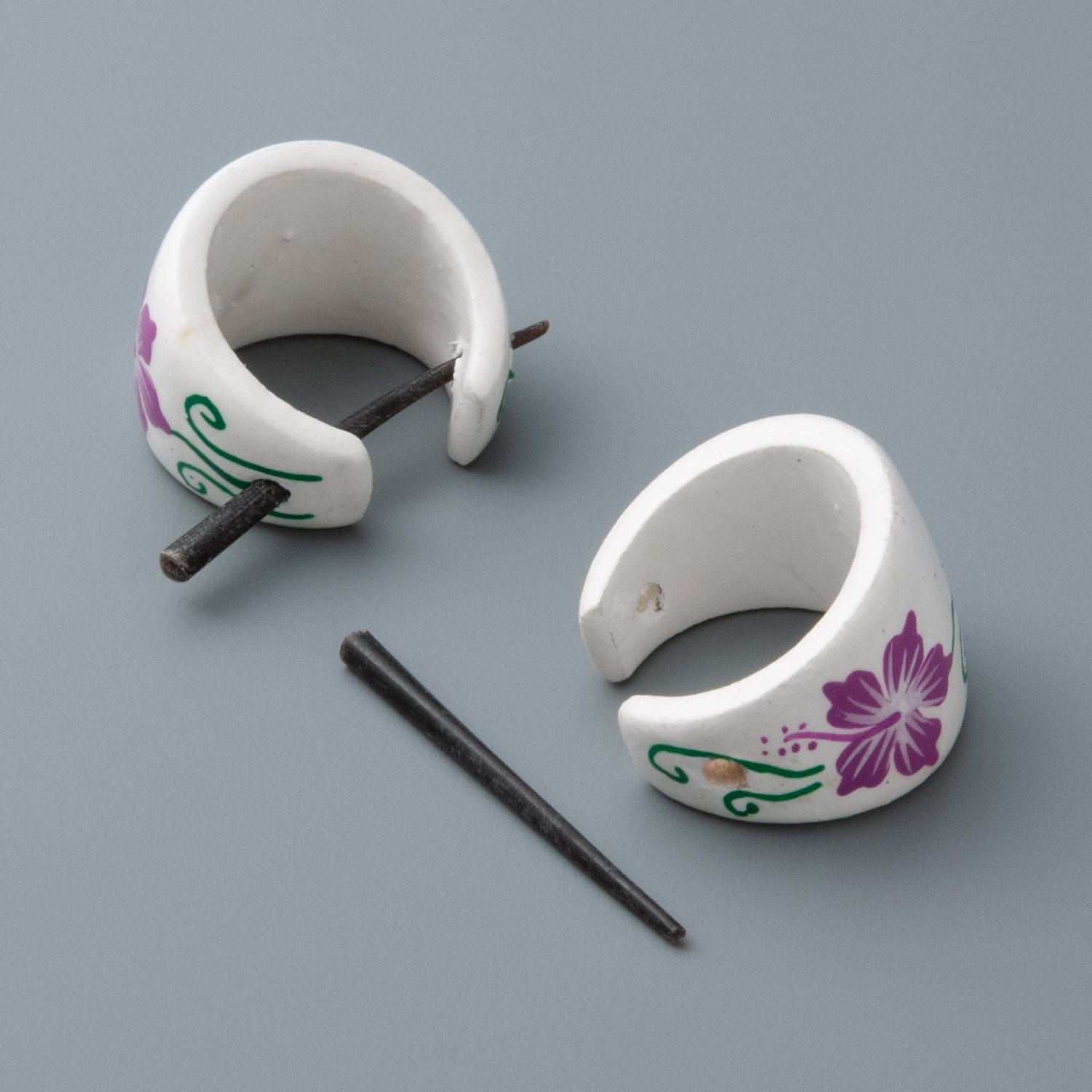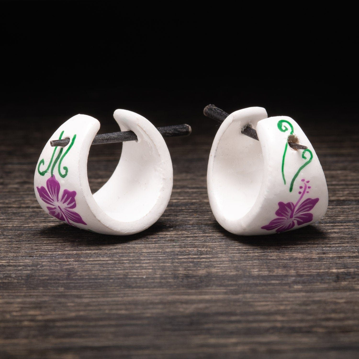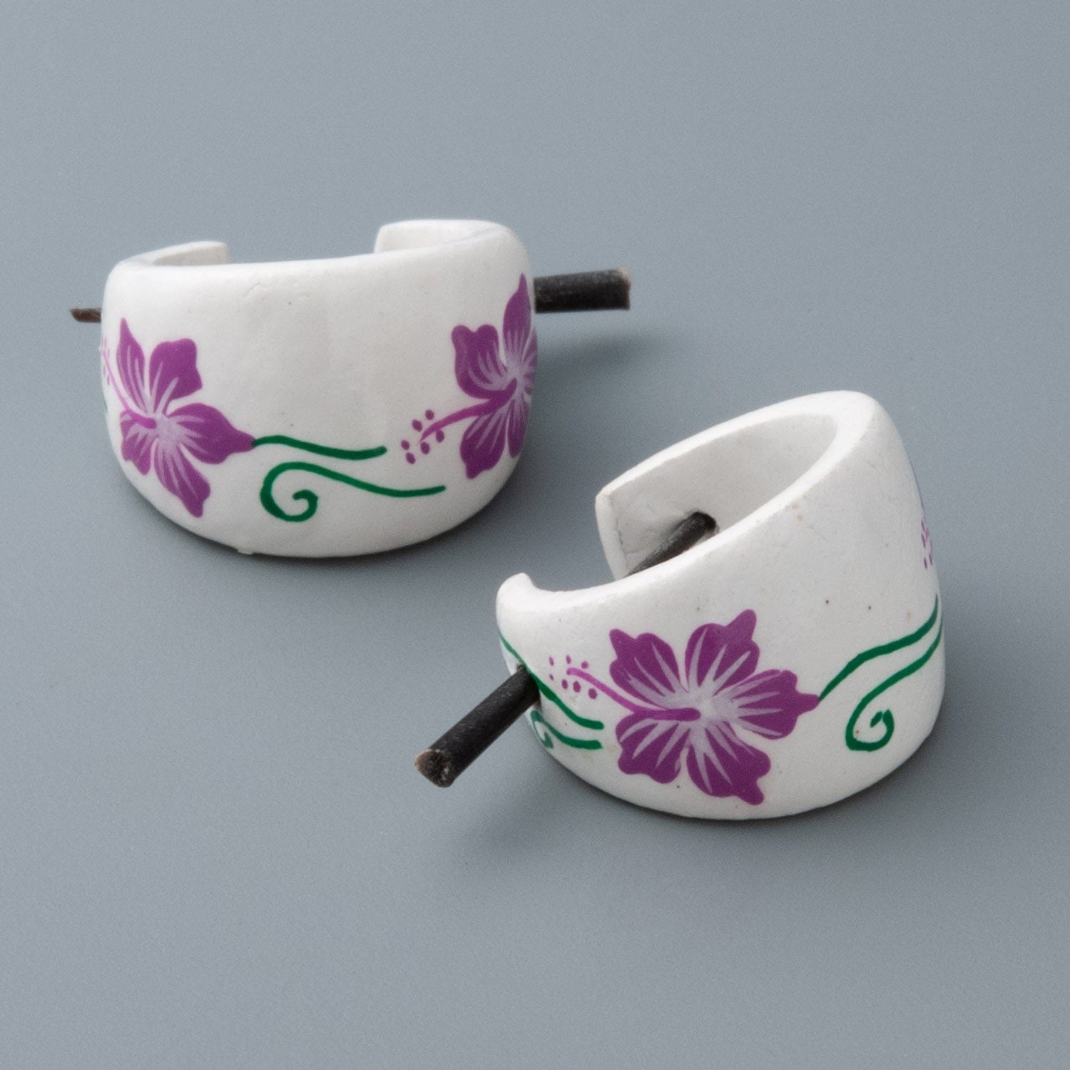 These horn pin earrings feature a smooth, matte white finish as the canvas for luscious pink floral designs and playful green swirls. Lightweight and comfortable, each pair is meticulously crafted and painted by hand, ensuring that no two sets are ever exactly alike.