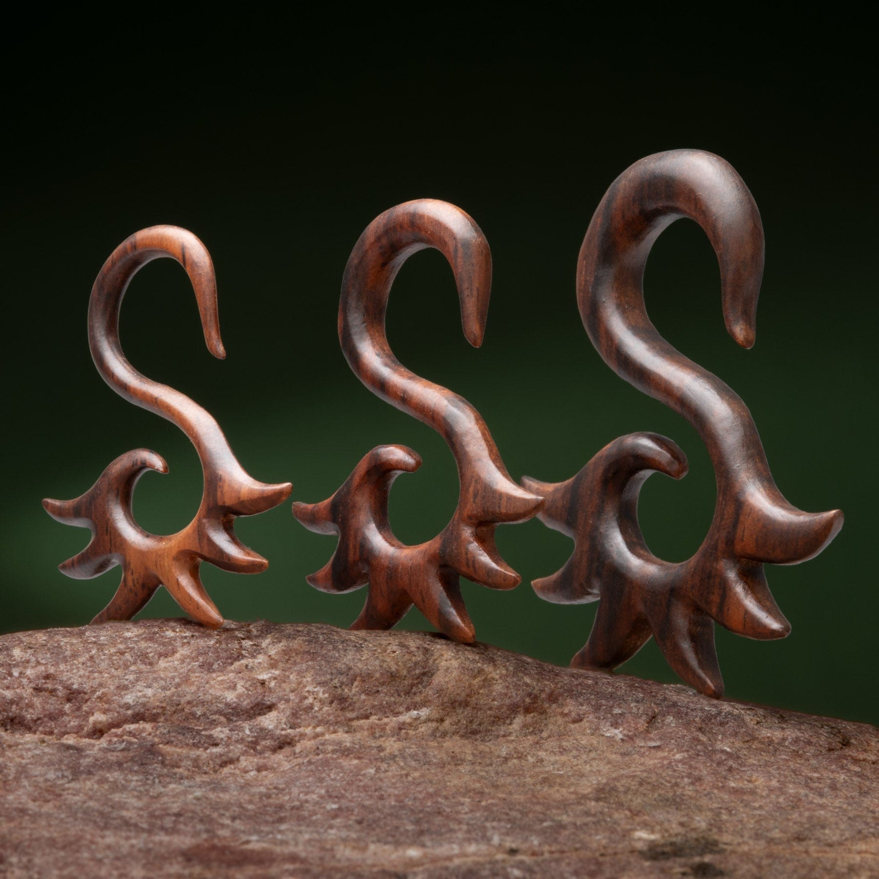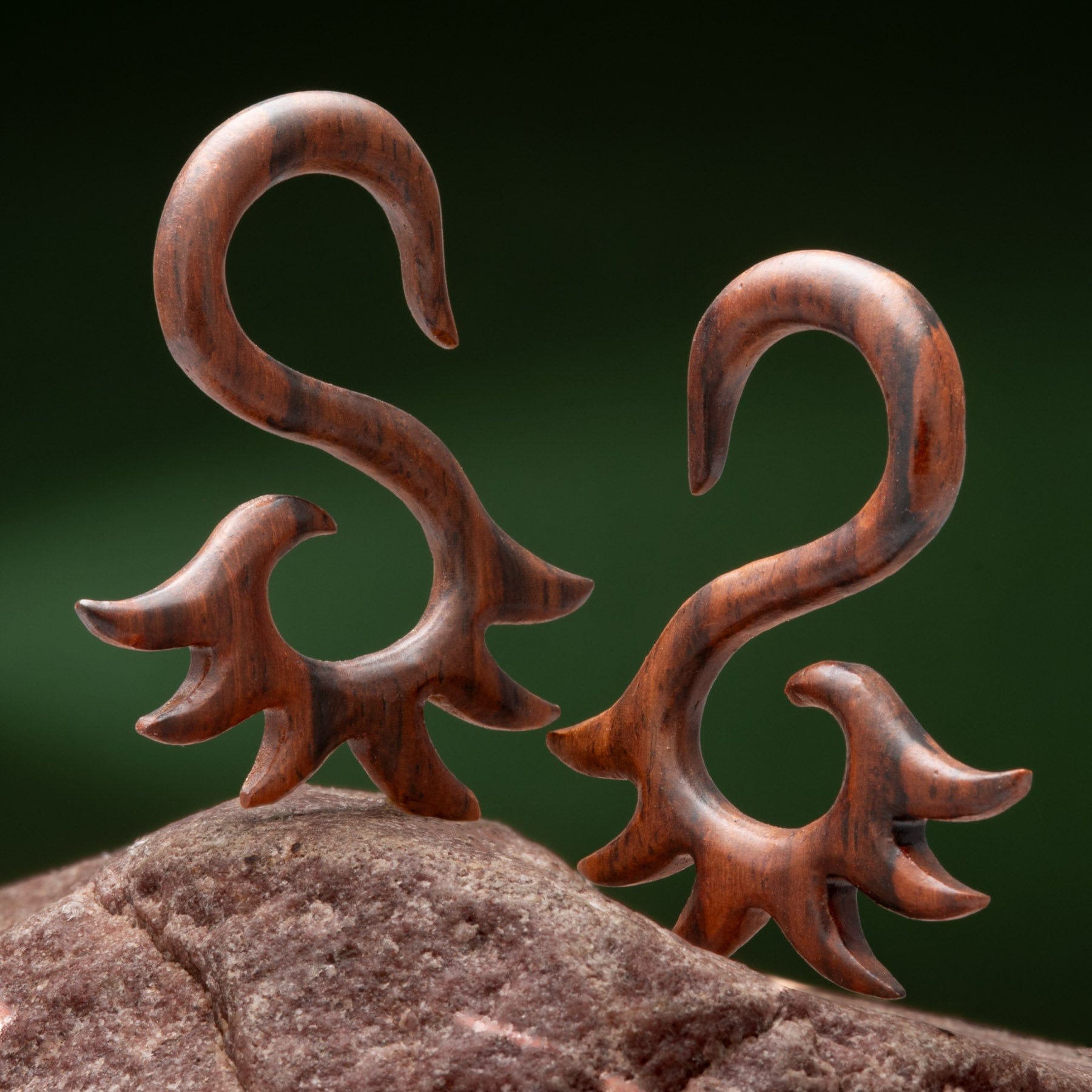 Unleash your wild side with these hand-carved Narra wood hangers, featuring an eye-catching feather-inspired silhouette. Each pair is meticulously crafted from natural narra wood, celebrated for its rich, reddish-brown tones and beautiful grain patterns that make every piece unique. The swirling “S” shape and dynamic, spiked edges add a bold, artistic flair—perfect for anyone looking to make a statement with their stretched ears.